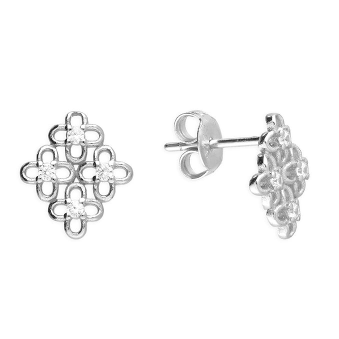 Sterling silver stud earrings featuring a symmetrical multi quatrefoil design, each motif accented with sparkling cubic zirconia for added brilliance.